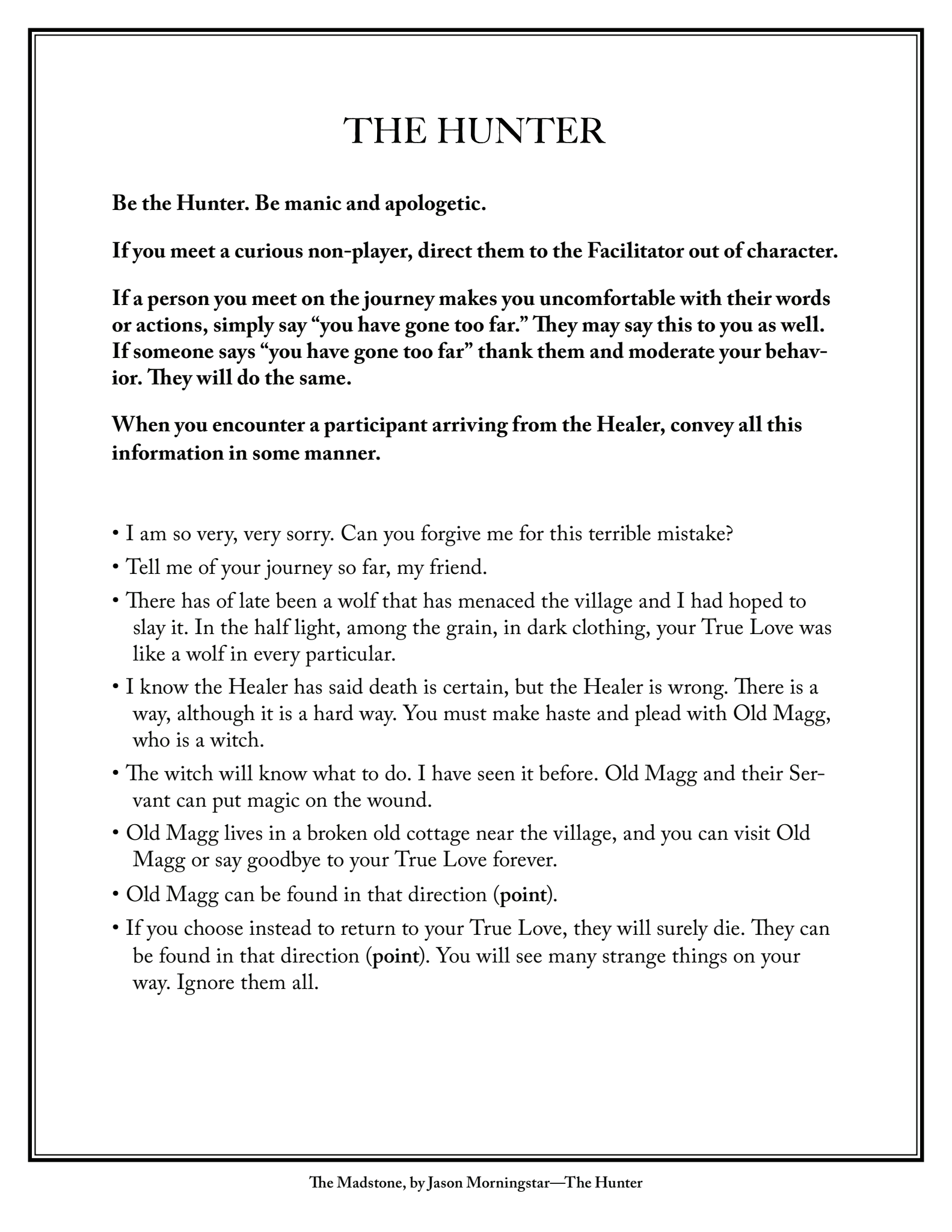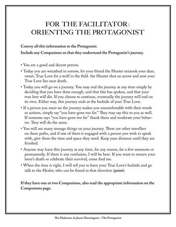 The Madstone is a live-action game designed to be played by a series of “sequential protagonists” all playing the central role, and a core group portraying the people and things they meet on their journey.