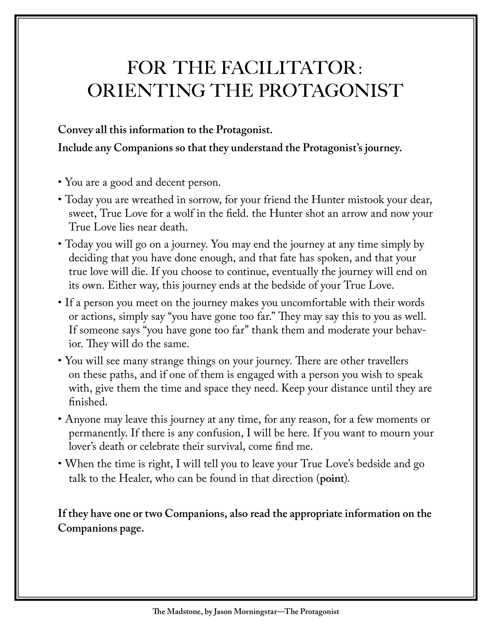 - Participants: One or more; each “unit of play” can be a single Protagonist or agroup consisting of Protagonist and one or two Companions.