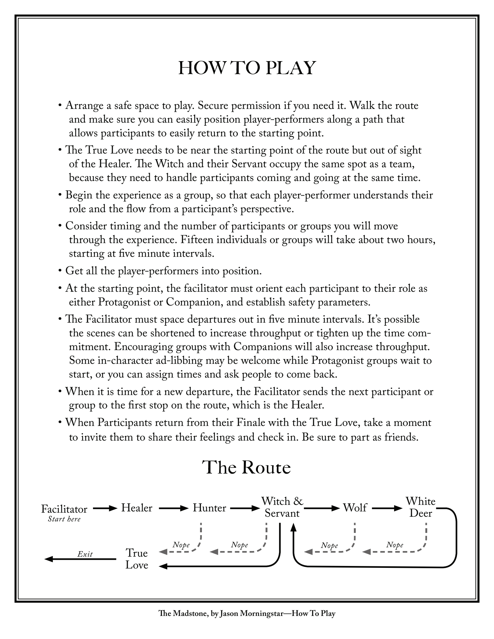 - Space: Any open space that allows protagonists to wander from one player-per-former to the next and return at any time to the starting point. Player-performers should, ideally, be within sight but out of earshot of one another. The experience could be set up in a park, or along a trail loop, or in an urban area with each player-performer stationed at a different bar, for example.